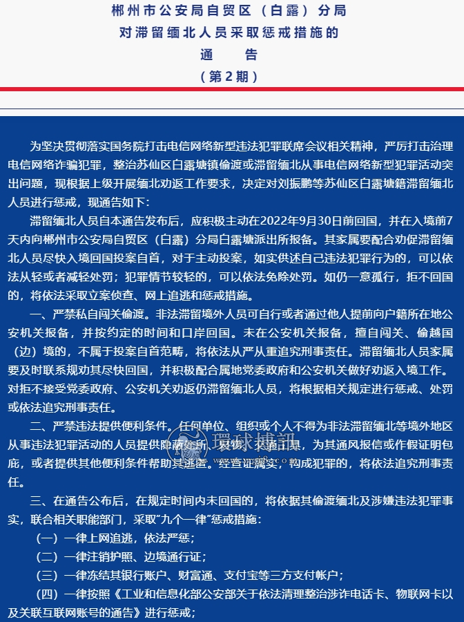 郴州市公安局自贸区(白露)分局对滞留缅北人员采取惩戒措施的通告(第2期) |