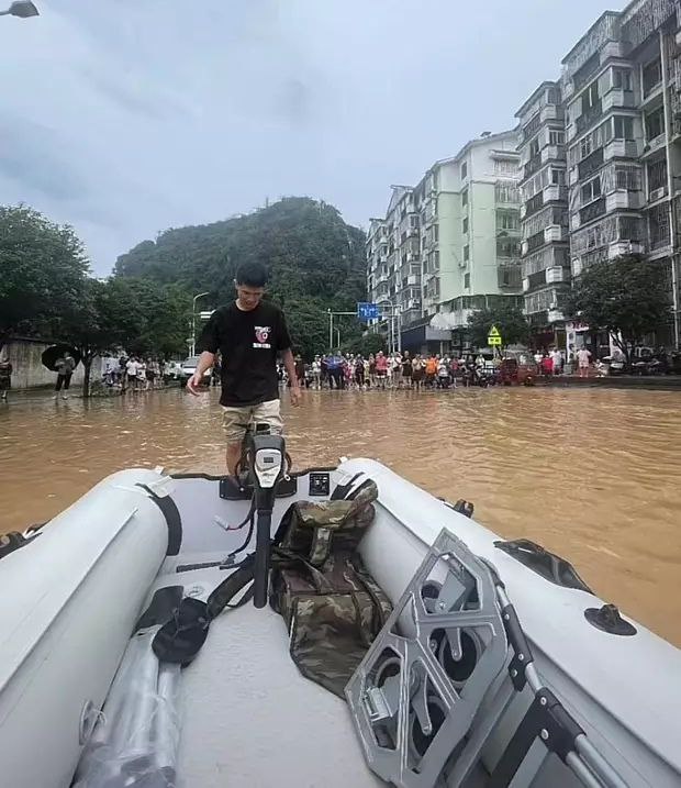 桂林洪水中有人抱住路灯杆被困车顶 |