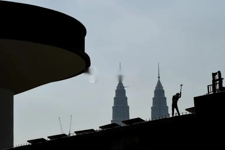 马来西亚首都吉隆坡,一名工人的剪影映衬在双子塔上。(法新社)