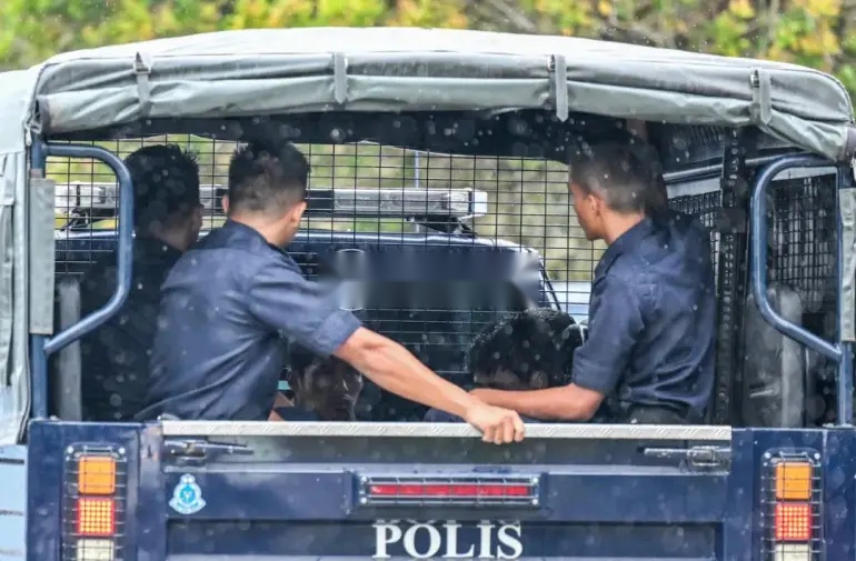 2024 年 2 月 2 日,马来西亚警方护送被拘留者前往位于马来西亚北部霹雳州美罗的移民拘留中心。(法新社)