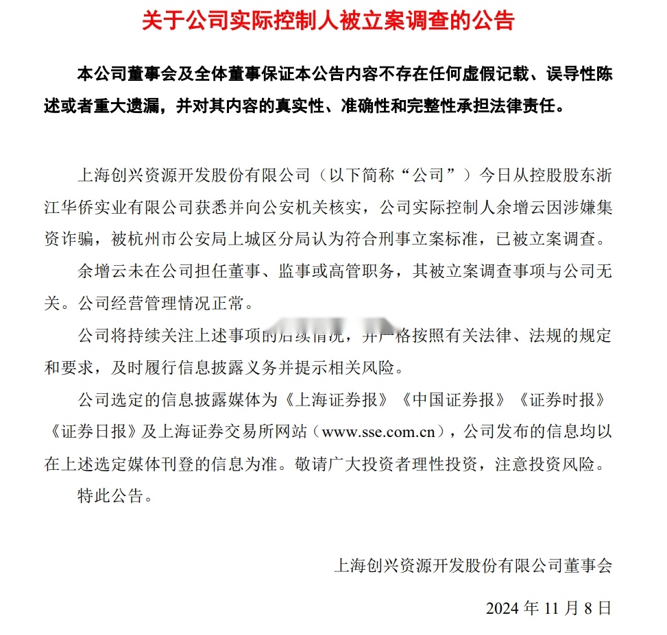 A股公司突然公告:实控人因涉嫌集资诈骗被立案调查! |